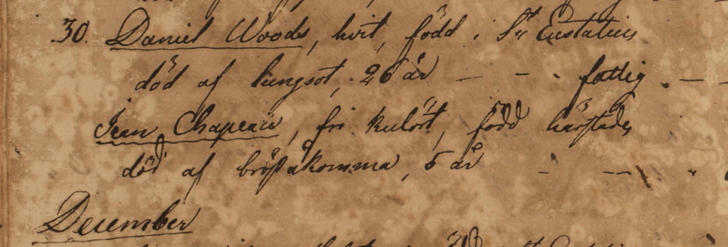 Dans le registre de l’Eglise Suédoise Lutherienne de Gustavia, on trouve l’inscription de son décès à la date du 7 octobre 1826, et on apprend qu’il était âgé de 70 ans, originaire de Marseille et marin.