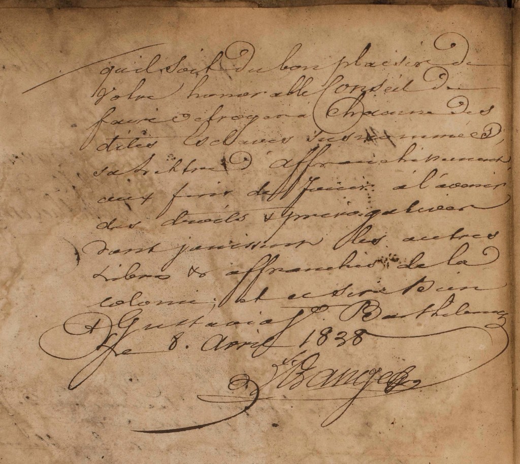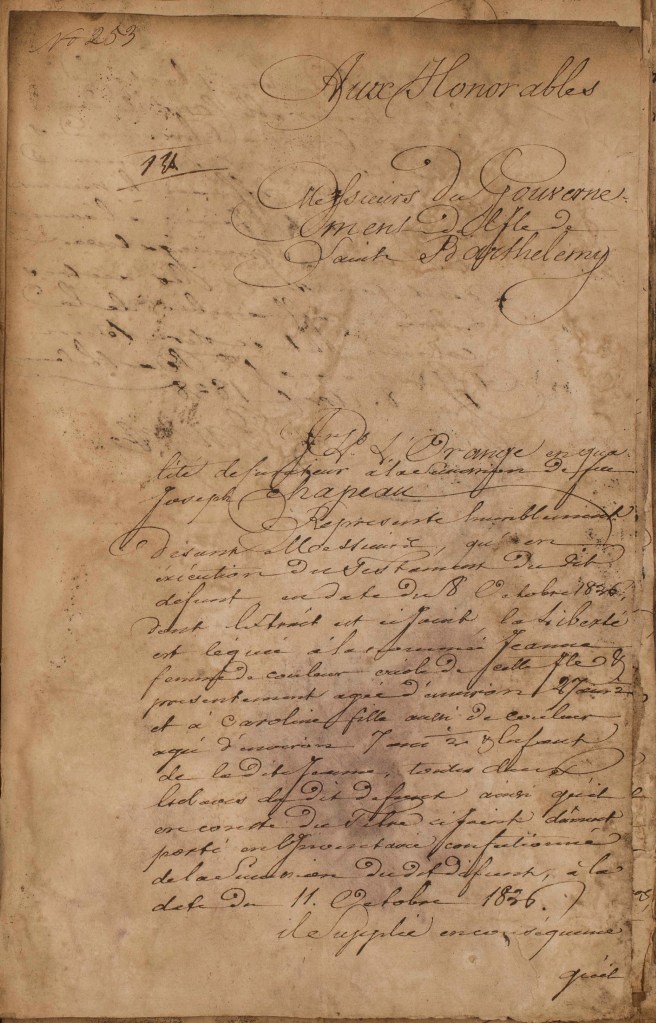 Monsieur L’ORANGE indique qu’en execution du testament du dit défunt, en date du 8 octobre 1826 dont extrait ci-joint, la liberté est léguée à la nommée Jeanne, femme de couleur créole de cette ile et présentement âgée d’environ 27 ans, et à Caroline, fille aussi de couleur âgée d’environ 7 ans 1/2, et enfant de la dite Jeanne, toutes deux esclaves du dit défunt ainsi qu’il en coule (?) du titre ci-joint dûment porté en l’inventaire confectionné de la succession du dit défunt à la date du 11 octobre 1826, de supplier qu’il soit du bon plaisir de votre honorable conseil de faire octroyer à chacune des dites esclaves sus-nommées sa lettre d’affranchissement aux fins de jouir à l’avenir des droits et prérogatives dont jouissent les autres libres et affranchis de la colonie, et ce sera bien »