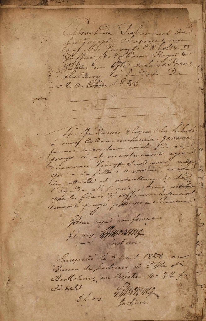 Pour copie conforme, article 4 » Je donne et lègue la liberté à mon esclave nommée Jeanne, femme de couleur, créole de ce pays-ci, et maintenant âgée d’environ vingt-six ans, ainsi qu’à sa fille Caroline, créole de cette île, et actuellement de l’âge de six ans ; bien entendu que les frais d’affranchissement seront payés par ma succession »