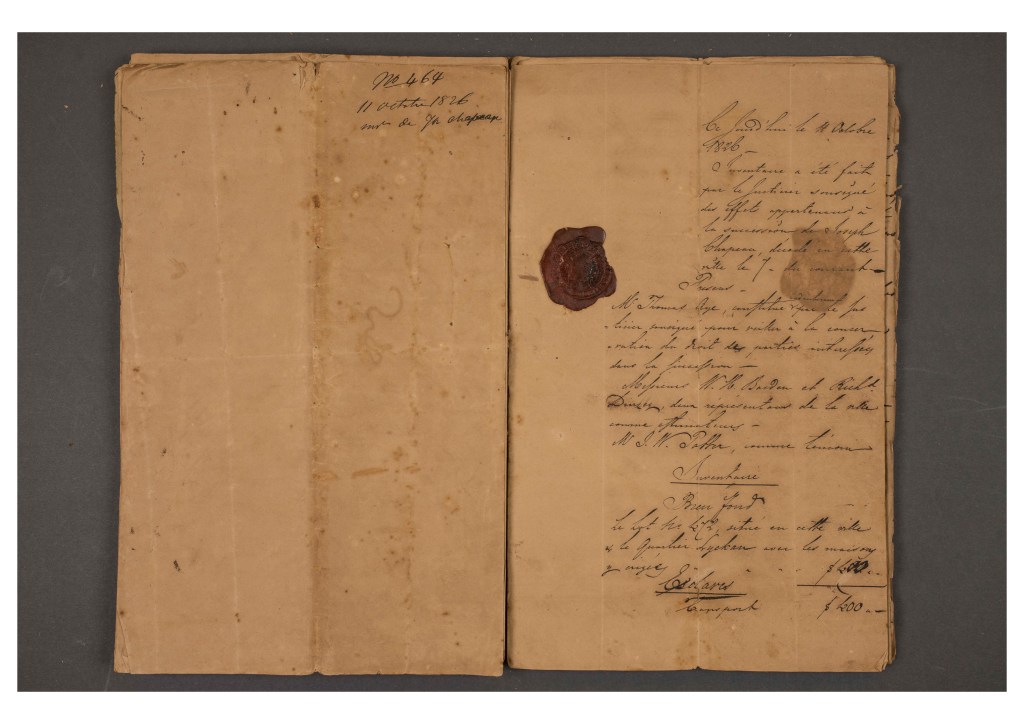 Le document ci-dessous extrait de l’inventaire, est la mention du « titre de vente au profit du défunt reçu devant notaire à la date du 4 juillet 1821 de la nègresse Jeanne avec son enfant fille de trois mois alors ».