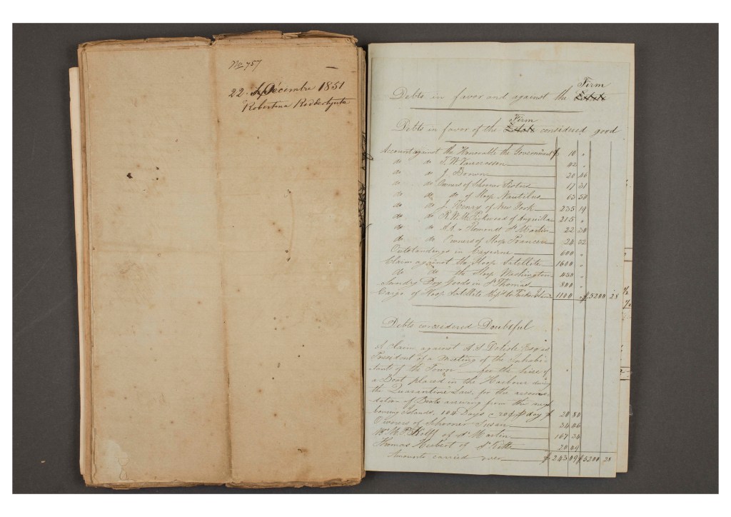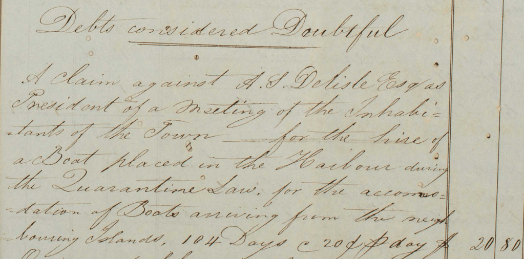 « A claim against Antoine SAPENNE DELISLE Esquire as President of a meeting of the inhabitants of the town, for the hire of a boat placed in the harbour during the quarantine law, for the accomodation of boats arriving from the neighbouring islands, 104 days at 20 cents per day, total 20.80 «