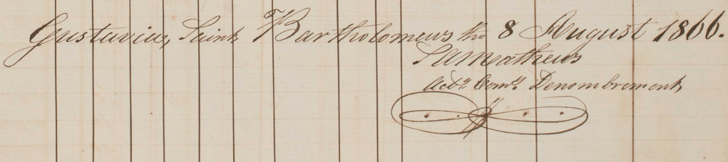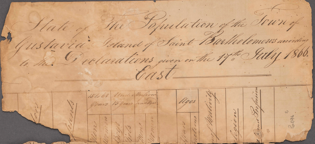 Entre le 17 juillet 1866 et le 8 aout 1866, le Gouvernement fait un dénombrement des habitants de Gustavia. Celui-ci est organisé en suivant la numérotation des terrains dans Gustavia, en commençant par le côté Est. Sont indiqués : le nom du propriétaire, s’il est vide ou occupé, et s’il est occupé, les informations des occupants avec les noms, prénoms, tranche d’âge, lieu de naissance, occupation et religion. Le tout fait une quarantaine de pages.