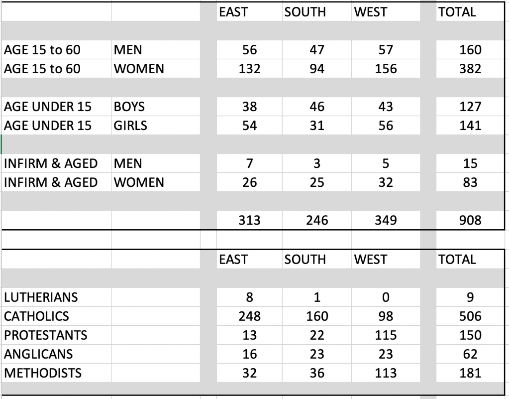 Les Suédois aimaient les statistiques semble-t-il, et tout est découpé en fonction du groupe d’âge, du sexe, du quartier de Gustavia ( Est, Sud et Ouest) et de la religion.