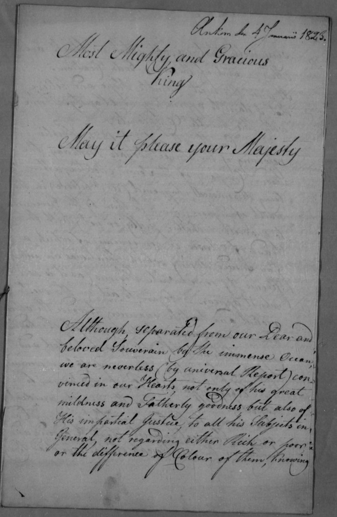 « Bien que séparés de notre cher et aimé souverain par l’immense océan, nous sommes néanmoins convaincus dans nos cœurs, non seulement de sa grande douceur et de sa bonté paternelle, mais aussi de sa justice impartiale pour tous ses sujets en général, qu’ils soient riches ou pauvres, ou de couleur différente, sachant bien que nous tous, hommes blancs ou noirs sommes la création du même Dieu.