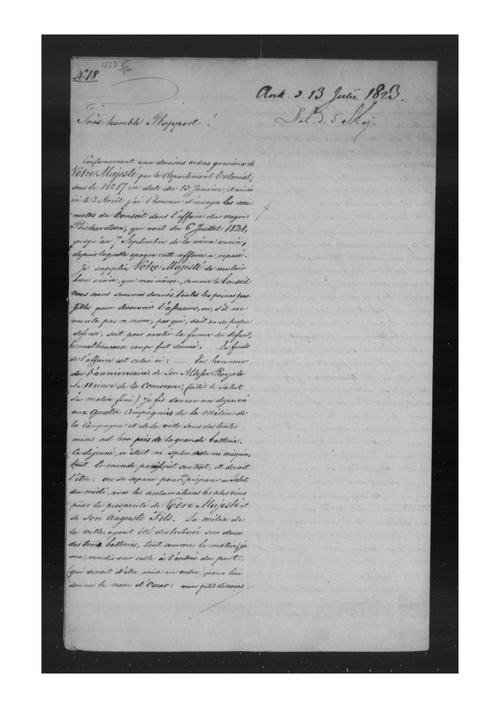 On ne sait pas si le Roi a répondu à Samuel RICHARDSON, néanmoins, il envoie une lettre au Gouverneur le 13 janvier 1823, soit neuf jours seulement après l’avoir reçue. Les instructions semblent demander au Gouverneur qu’il s’explique sur l’affaire. Celui-ci envoie sa réponse au Roi le 5 Mai et elle est reçue en Suède le 13 juillet 1823.