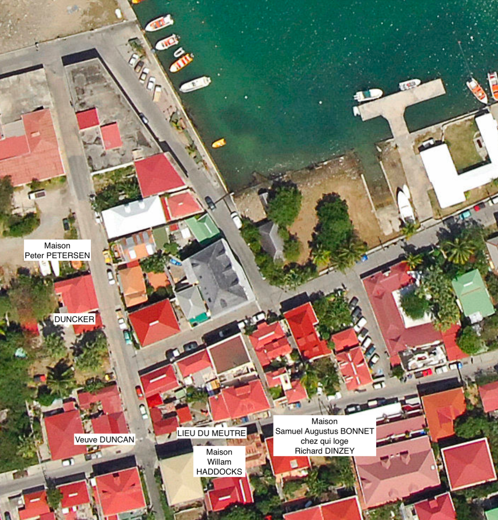 Vous croiserez de nombreux personnages portant des noms disparus aujourd’hui à Saint-Barthelemy, mais je n’ai malheureusement pas d’informations sur tous. Ci-joint un petit tableau récapitulatif sur les protagonistes de cette histoire. On peut noter, et je pense que cela permet de mieux comprendre ce qui se passe, que Peter PETERSEN, le major de la milice, est lié intimement à plusieurs des officiers blancs. Robert est son frère, et leur soeur, Eliza, est l’épouse de Richard DINZEY (en 1822). Une autre soeur, Angelina PETERSEN, épousera (vers 1827) William BONNET, fils de Samuel Augustus. Egalement, Richard DINZEY loge chez BONNET. Rajoutons que les DINZEY, VAUGHAN, HADDOCKS, BEAKS et WINFIELD sont tous originaires de Saba.