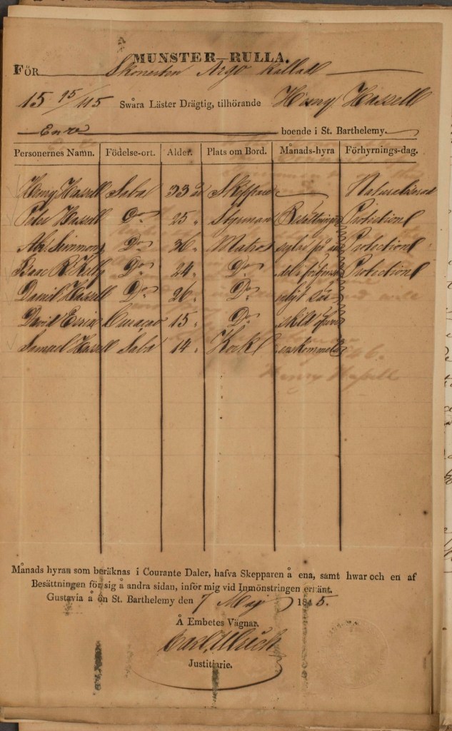 Schooner « Argo », belongs to Henry HASSELL (naturalized) and he also is the Captain. Total 7 crews including one from Curacao. Gustavia 7th May 1845