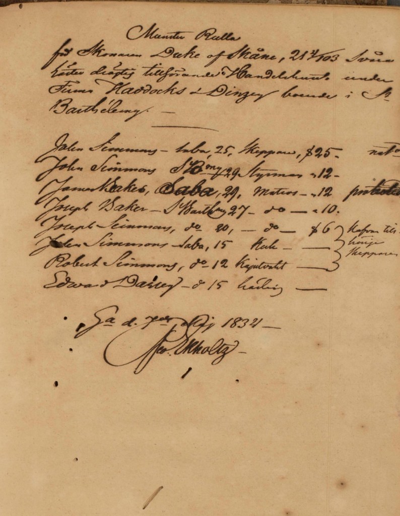 A total of 8 crew, including 3 slaves belonging to the Captain John SIMMONS. One can see there are 3 crews with Sabans names that are said to be from Saint-Barth.