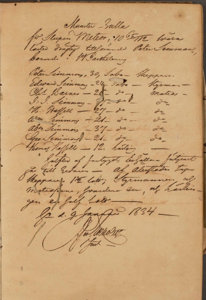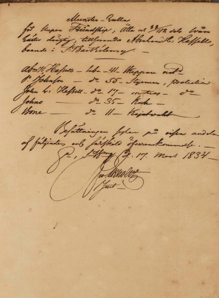 Sloop « Friendship », belongs to Abraham HASSELL, and he is also the Captain onboard. Gustavia, 17th March 1834.