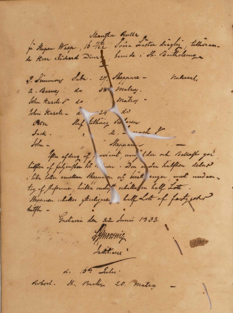 Sloop « Wasp » belonging to Richard DINZEY, in Gustavia on the 22d June 1833 with 7 crews including 3 slaves, captain Peter SIMMONS.