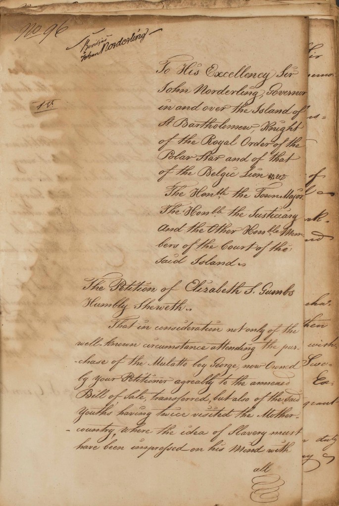 Le 9 fevrier 1822, Elizabeth S. GUMBS envoie une petition au Gouverneur de Saint-Barthelemy, Johan NORDERLING.