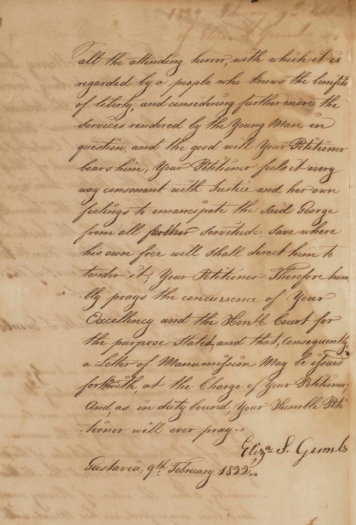 « En considération, non seulement des circonstances bien connues entourant l’achat du garçon mulâtre George, que je possède maintenant selon la preuve d’achat ci-jointe, mais aussi que ce jeune garçon ayant déjà visité deux fois la mère patrie où l’idée de l’esclavage a du marquer son esprit avec l’horreur dans laquelle il est vu par un peuple qui connait les bénéfices de la liberté, et aussi considérant les services rendus par le jeune homme en question, et la bonne estime dans laquelle la demanderesse le tient, votre demanderesse pense que tout s’accorde avec la justice et son propre sentiment d’émanciper le dit George de toute forme de servitude, sauf là où son libre arbitre le menera pour la présenter, la demanderesse prie donc humblement de son concours son Excellence et l’Honorable Cour pour cette demande, et que donc une lettre de manumission puisse être établie à la charge de votre demanderesse, liée dans le devoir, votre humble demanderesse, à jamais. »