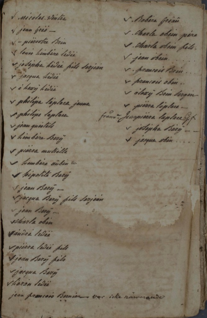 « Disant Messieurs que le 14 de septembre dernier, vers heures du matin, les habitants dénommés dans la liste ci-jointe, au nombre de trente cinq, se sont portés en foule au dit étang où ils ont pêché malgré la défense qu’en a obtenue le suppléant de son excellence Monsieur le Gouverneur, en date du 26 juillet dernier suivant l’extrait et dont copie est ici annexée et que, non contents d’avoir pêché et pris la quantité de poisson qu’ils ont voulu sans le consentement du suppliant, ils ont encore détruit un mur sec que le suppliant avait fait faire à l’embouchure du dit étang pour empêcher la sortie du poisson, et ont renversé divers cadres en fil et laiton qu’il y avait fait mettre un peu au dessus de l’embouchure pour les mêmes causes, ce qui peut être constaté par le certificat ci-joint de la visite faite par Monsieur FAHLBERG en date du 17 du dit mois de septembre, et encore par Messieurs Joseph BERNIER, Pierre Paul LAPLACE fils, Pierre VIANIS et Jacques AUBIN dit Vittet, qui ont été envoyés querir par le suppliant lorsque les habitants susdits entraient dans l’étang ».