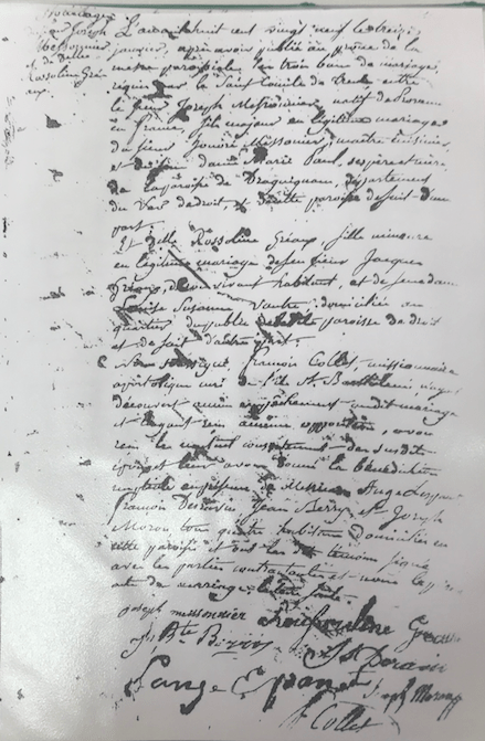 « Joseph MEISSONNIER, natif de Provence en France, fils majeur et légitime de sieur Honoré MEISSONNIER, maitre cuisinier, et de feue dame Marie PAUL, ses pères et mères de la paroisse de Draguignan, département du Var de droit, et de cette paroisse de fait, d’une part ,
