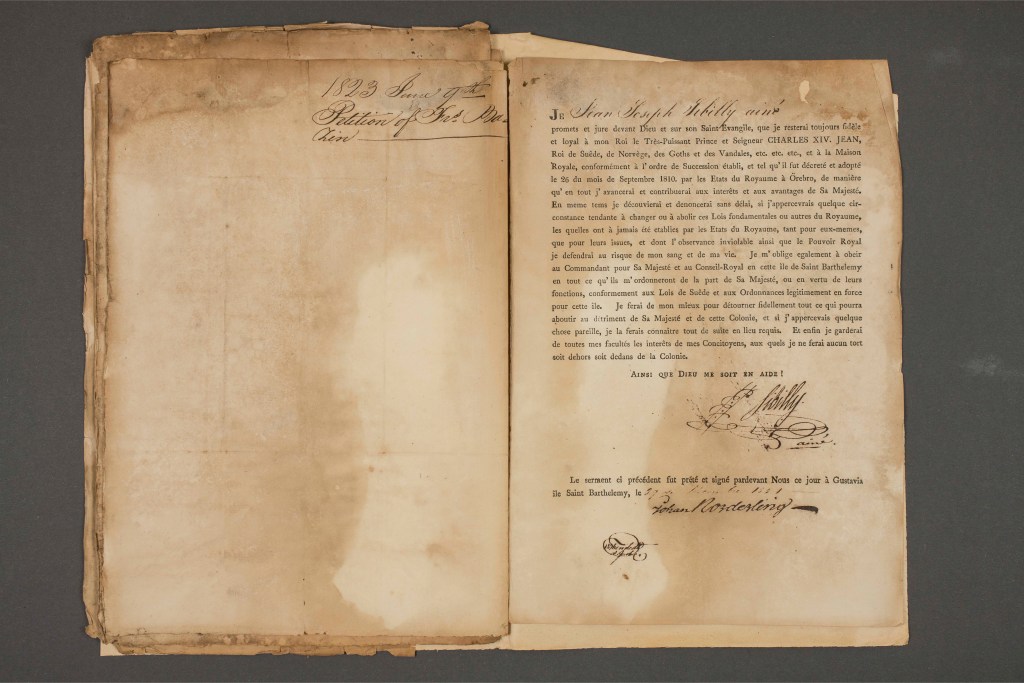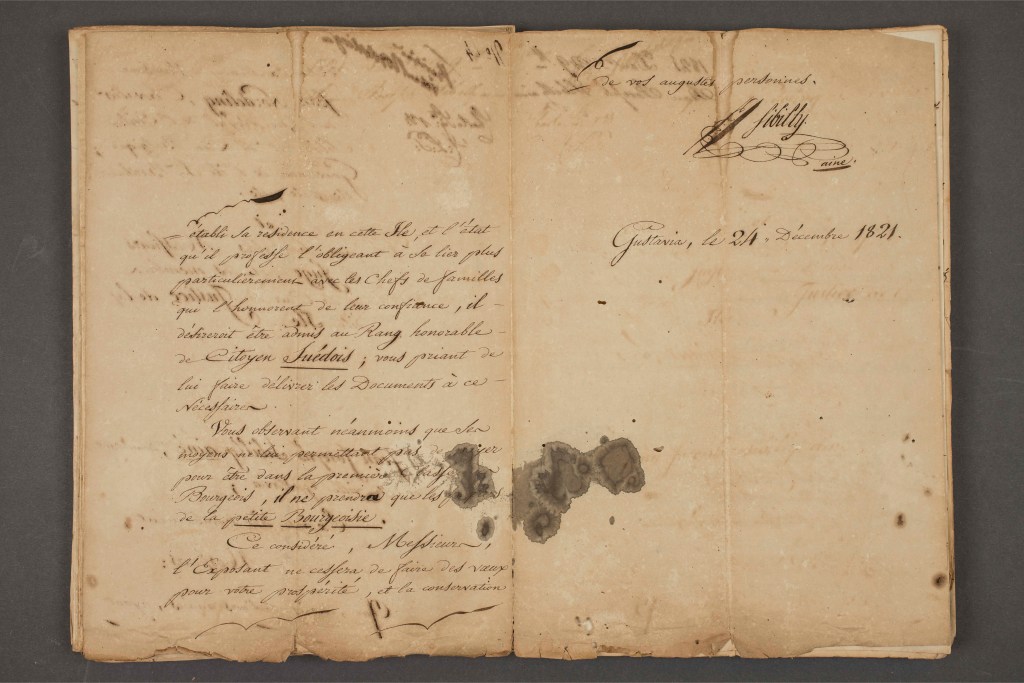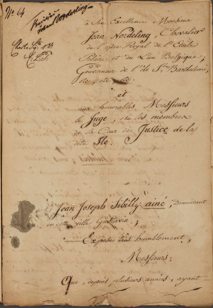 « Jean Joseph SIBILLY ainé, demeurant en cette ville de Gustavia, expose très humblement, Messieurs : que depuis plusieurs années, ayant établi sa résidence en cette ile, et l’état qu’il professe l’obligeant à se lier plus particulièrement avec les chefs de familles qui l’honorent de leur confiance, il désirerait être admis au rang honorable de Citoyen Suédois ; vous priant de lui faire délivrer les documents à ce nécessaires, vous observant néanmoins que ses moyens ne lui permettent pas de payer pour être dans la première classe des bourgeois, il ne prendra que les papiers de la petite bourgeoisie, ce considéré, Messieurs, l’exposant ne cessera de faire des vœux pour votre prospérité et la conservation de vos augustes personnes ».