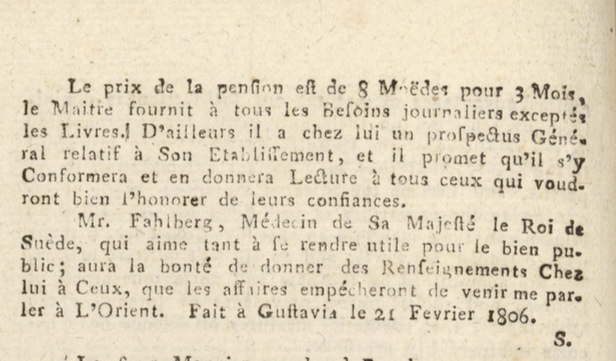 Monsieur FAHLBERG, médecin de sa majesté le Roi de Suède, qui aime tant à se rendre utile pour le bien public, aura la bonté de donner des renseignements à ceux que les affaires empêcheront de venir me parler à L’orient ».