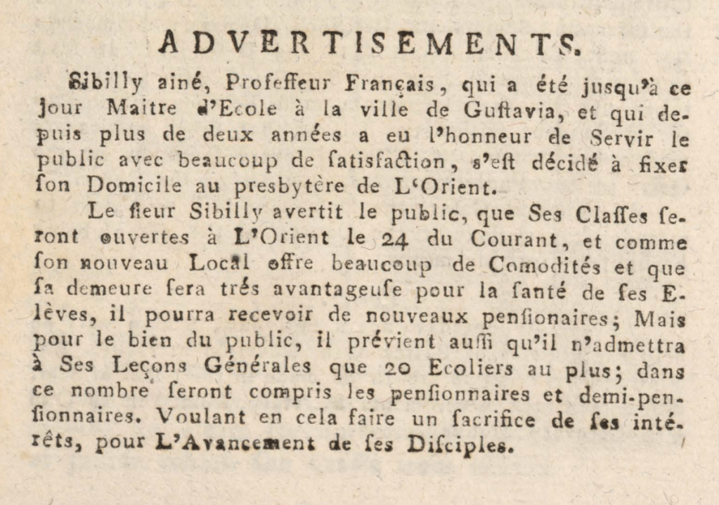 Dans l’annonce ci-dessus datée du 21 février 1806 et parue dans le journal du 15 mars, il se dit « Professeur Français qui a été jusqu’à ce jour, Maître d’Ecole à la ville de Gustavia, et qui depuis plus de deux années, a eu l’honneur de servir le public avec beaucoup de satisfaction, s’est décidé à fixer son domicile au presbytère de Lorient. Le Sieur SIBILLY, avertit le public, que ses classes seront ouvertes à Lorient le 24 du courant, et comme son nouveau local offre beaucoup de commodités et que sa demeure sera très avantageuse pour la santé de ses élèves, il pourra recevoir de nouveaux pensionnaires, mais, pour le bien du public, il prévient aussi qu’il n’admettra à ses leçons générales que 20 écoliers au plus, dans ce nombre seront compris les pensionnaires et demi-pensionnaires. Voulant en cela faire un sacrifice de ses intérêts pour l’avancement de ses disciples.