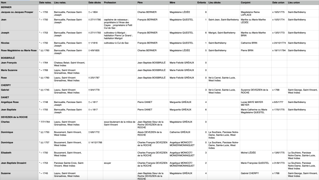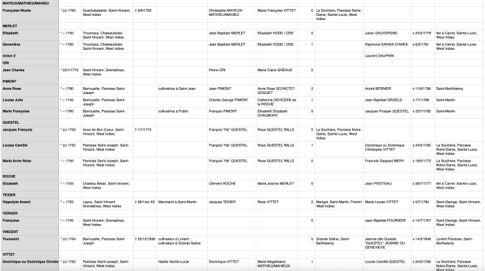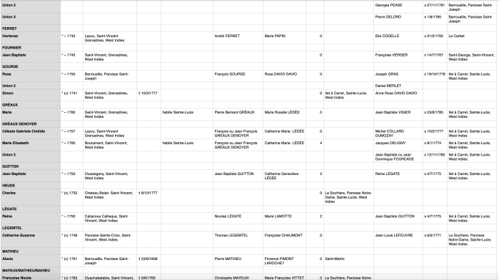 Il est à noter, qu’apparemment, les registres et archives Catholiques auraient brulées en 1920 dans l’incendie du presbytère de Cariacou, ce qui semble limiter la possibilité de trouver plus d’informations un jour.