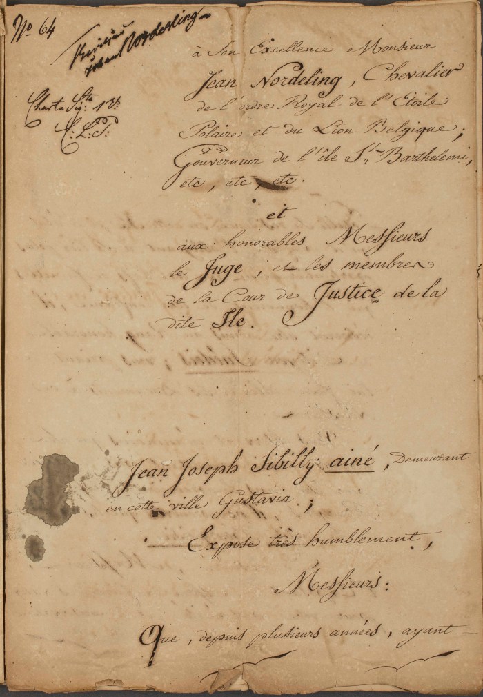 « Jean Joseph SIBILLY elder, residing in this city of Gustavia, exposes very humbly, Gentlemen: that for several years, having established his residence in this island, and the state which he professes obliging him to bind himself more particularly with the heads of families who honor him with their trust, he would like to be admitted to the honorable rank of Swedish Citizen; begging you to issue him with the necessary documents, observing you nevertheless that his means do not allow him to pay to be in the first class of the bourgeoisie, he will only take the papers of the petty bourgeoisie, this considered, Gentlemen, l ‘exhibitor will not cease to make wishes for your prosperity and the preservation of your august persons‘.
