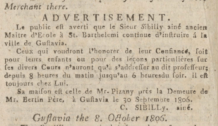 On October 16, another announcement appeared in the same newspaper: “The public is warned that the elder Sieur SIBILLY, former Schoolmaster in Saint-Barthélemy, continues to teach in the city of Gustavia. Those who want to honor him with their trust, either for their children or for private lessons on his various courses, will only have to contact the said teacher, from 8 a.m. until 6 p.m. , he is still at home. His house is that of Mr PIZANY, near the house of Mr BERTIN father in Gustavia, September 30, 1806 ”.