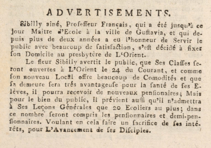 In the above advertisement dated February 21, 1806 and published in the newspaper of March 15, he said to himself « French teacher who has been until this day a School Master in the city of Gustavia, and who for more than of two years, had the honor of serving the public with great satisfaction, decided to set up his home in the presbytery of Lorient. Sieur SIBILLY, warns the public, that his classes will be open in Lorient on the 24th of the current, and as his new premises offer many amenities and that his home will be very advantageous for the health of his students, he will be able to receive new boarders, but, for the good of the public, he also warns that he will admit to his general lessons only 20 pupils at most, in this number will be included the boarders and half-boarders. Wanting in this to make a sacrifice of his interests for the advancement of his disciples.