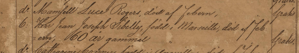 Jean Joseph SIBILLY died in Gustavia on May 5, 1840, and it was recorded on the 6th. He is said to be a native of Marseille and died of fevers, aged 60.