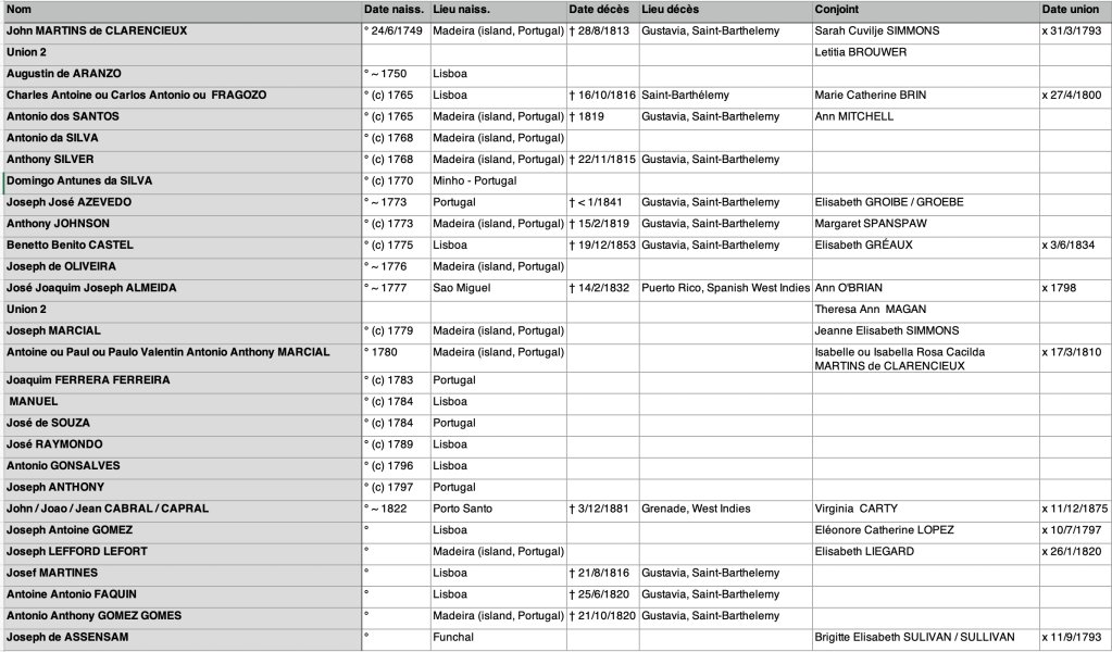 Si vous avez lu les articles précédents, vous avez entendu parler de Jose Joaquim ALMEIDA (dont une partie de sa descendance vit toujours ici) et de Joao MARTINS de CLARENCIEUX, résidents de Gustavia et nés Portugais (le premier sur l’île Sao Miguel aux Açores, le second à Madeira).