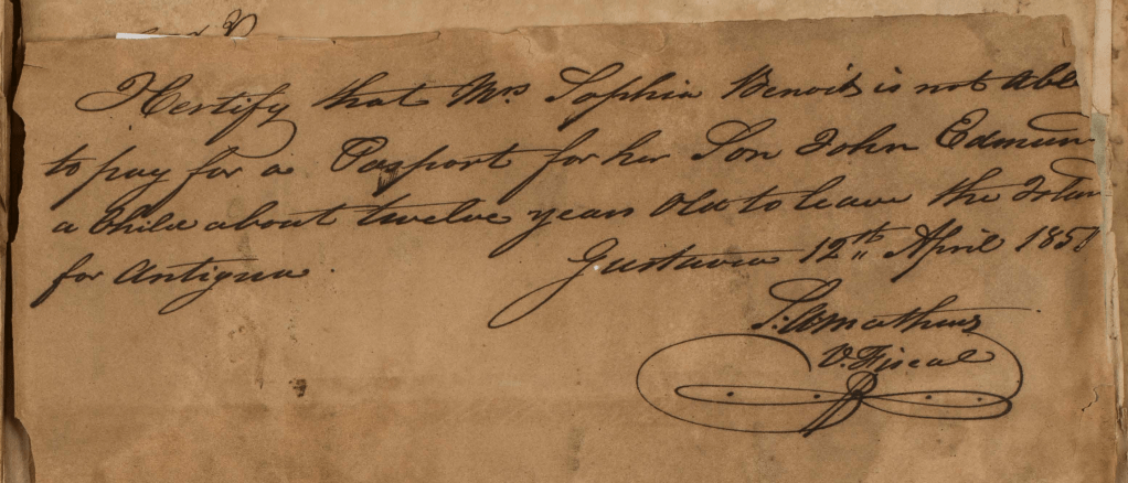 Le 12 avril 1851, le Vice-Fiscal de Gustavia, Samuel Augustus MATHEWS confirme que la Madame Sophie BENOIT n’est pas en mesure de payer le prix du passeport pour envoyer son fils John Edmond, âgé de 12 ans, à Antigua. Avec cette confirmation officielle, le passeport est établi sans frais.