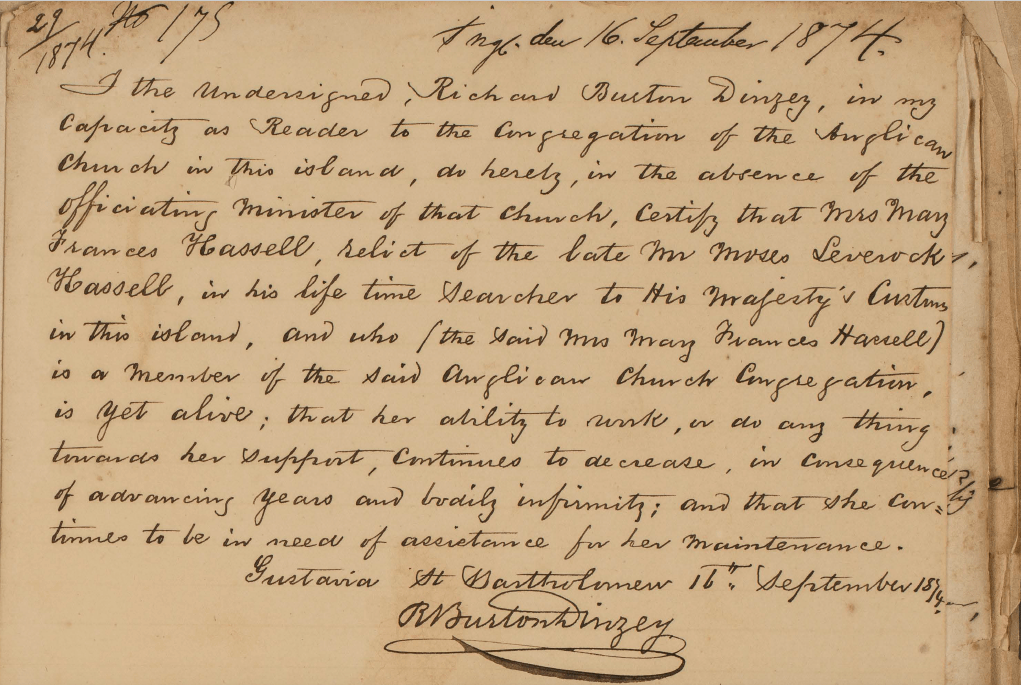 On the 16th of September 1874, at the Anglican church, Richard Burton DINZEY signs a certificate stating « that Mary Frances HASSELL ability to work or do anything towards her support, continues to decrease, in consequence of advancing years and bodily infirmity, and that she continues to be in need of assistance for her maintenance ».