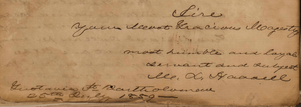On the 18th of June 1857, Moses Leverock HASSELL, Custom’s Searcher in Gustavia, writes a touching letter to the Governor.