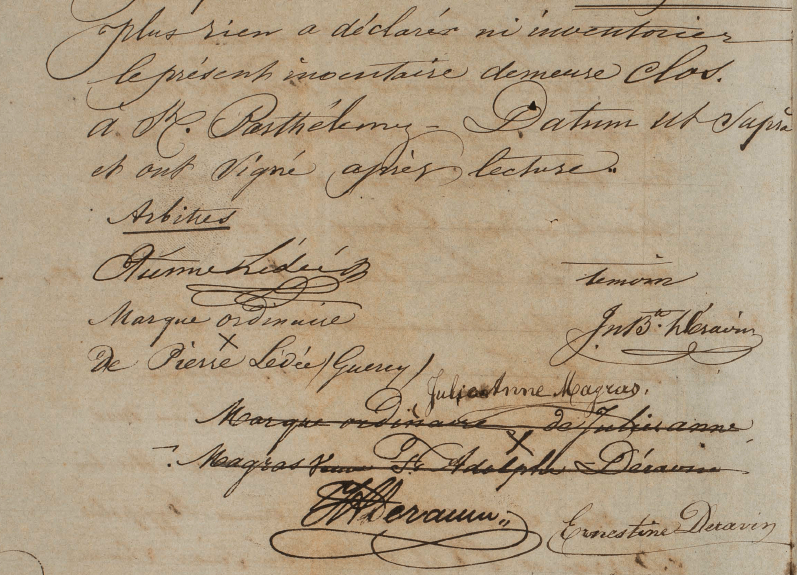 « Il est convenu que la plantation doit être retournée dans le même état qu’elle est au jour de la signature. Les nègres, le troupeau et la basse-cour comme sur la liste, sauf évènement imprévu ».