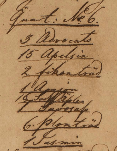 Avec aussi, mais sans détail, des citronniers, goyaviers, pommes surettes, frangipaniers