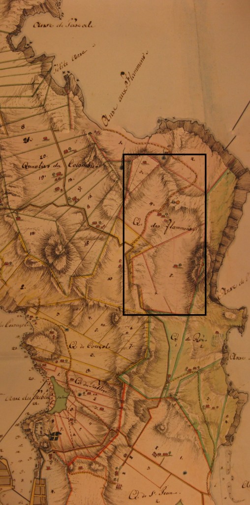 Ci-dessous, un bel exemple bien documenté, d’une habitation située entre les hauts de Corossol, Colombier et Flamands vers 1805, en gros, toute la zone qu’on appelle maintenant « Merlet » en débordant un peu.