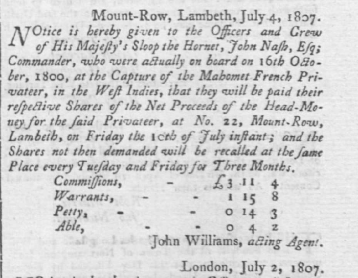 C’est le sloop HMS « Hornet » commandé par le Capitaine John NASH qui capture le corsaire Français « Mahomet » aux Antilles le 16 octobre 1800. L’information est donnée dans la London Gazette du 4 juillet 1807. S’agit-il du même bateau ? A vrai dire, je n’en suis pas totalement sûr. En effet, un schooner, et corsaire Français « Mahomet », est pris par le HMS « Hawke» le 8 juillet 1798 devant Sainte-Lucie, soit quelques jours après l’attaque du « Resolution ».