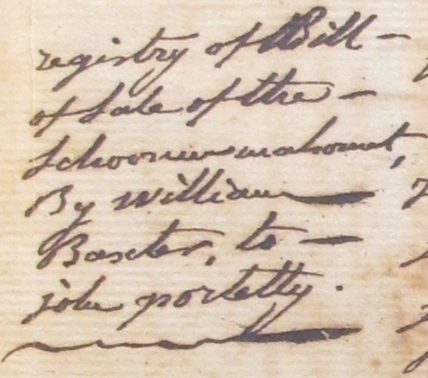 Que tout le monde sache, que par la présente, moi, William BAXTER, agent du sloop de guerre de sa Majesté (Britannique), J. NASH commandant, ai vendu  à Monsieur John PORTELLY de l’île de Saint-Barthélemy, le schooner « Mahomet », pris à la République de France, et condamné comme prise, pour la somme de sept-cent-quarante-deux Livres et dix Shillings payés à moi en espèces ».