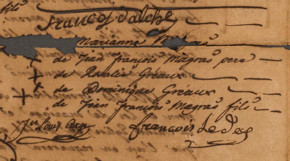Sur l’acte de décès de Marie Françoise elle est dite « fille naturelle de feu François LARCHET et de feue dame Marthe Catiche ». Je pense que Marie Françoise est une fille illégitime de François DALCHÉ et d’une femme de couleur libre. Marie-Françoise n’est pas reconnue car elle ne figure pas sur la succession de son père en 1806.