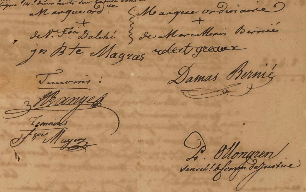 Les témoins sont « Jean Louis L’ORANGE, François MAYER avec l’assistance de sieurs Robert GRÉAUX, Damas BERNIER et Marc Alexis BERNIER, habitants de cette île et y demeurant, appelés et requis comme amiables compositeurs des lots ».