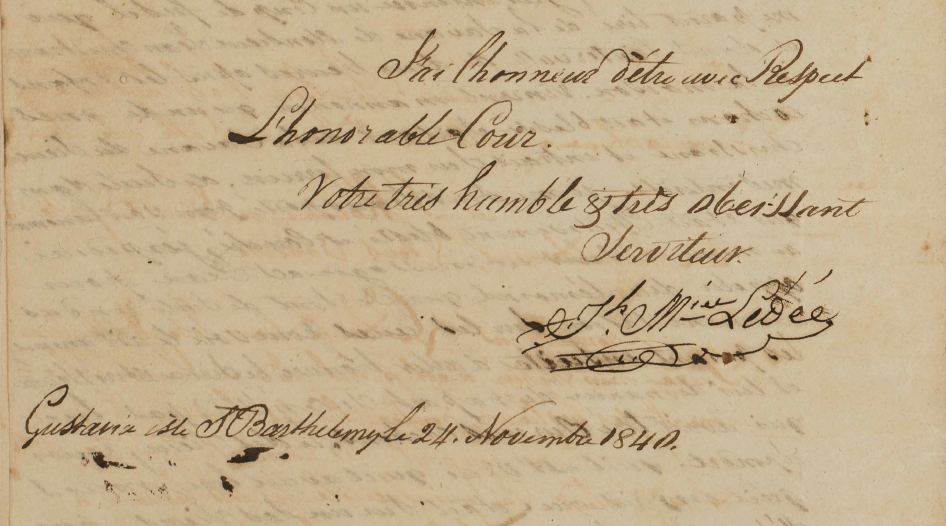 Le 24 novembre 1840, Joseph Maurice LÉDÉE envoie un courrier à la Cour de Justice. Le document est incomplet, il en manque toute la première partie.