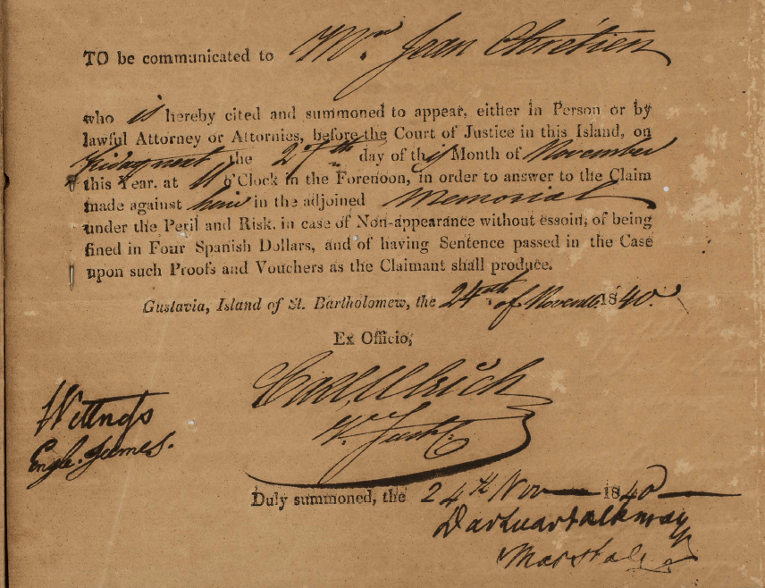 Le sieur « CHRISTIANE » est en fait Jean CHRÉTIEN, un marin Italien né à Trieste vers 1784. Il a épousé Susanna HEARDLY, native de Saint-Eustache, en 1820 à Gustavia, et avec qui il aura au moins trois enfants (on pourra noter, pour la petite histoire, que par sa fille Mary, il est le grand-père maternel de Selma Justina MILANDER, la « dernière Suédoise » décédée à Gustavia en 1939). En 1833, après le décès de sa première épouse, Jean CHRETIEN épouse Placide BERRY, native de Lorient, fille de François BERRY et de Marie Marthe BERNIER. Ils n’auront pas d’enfant.