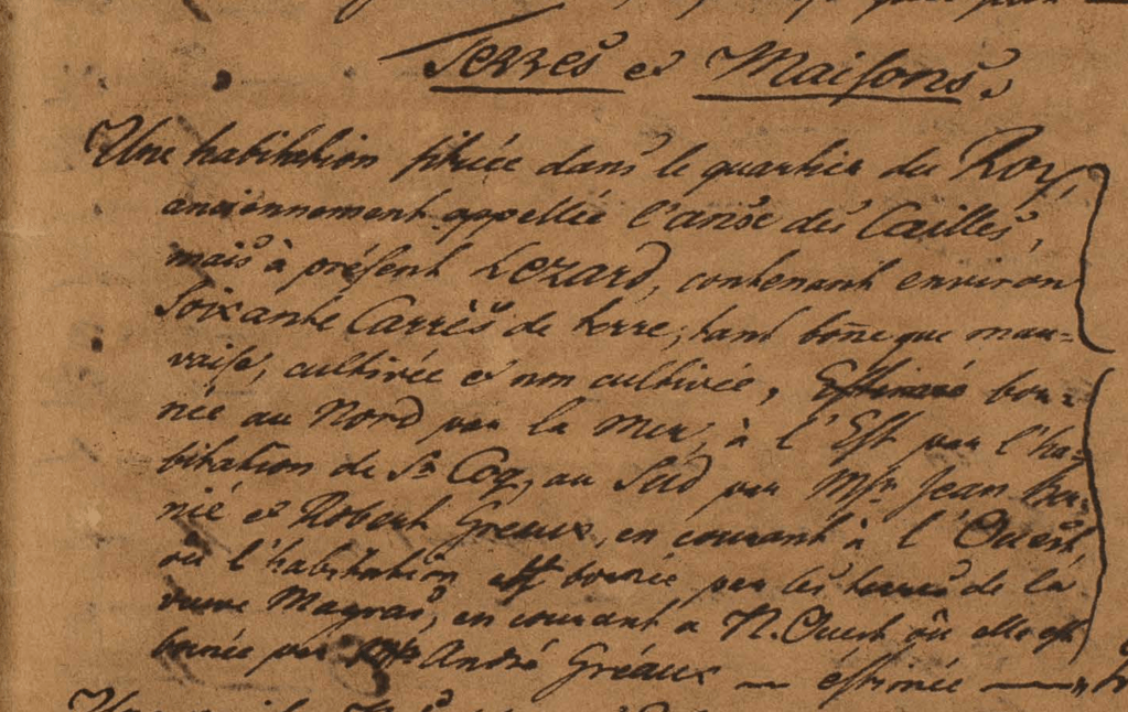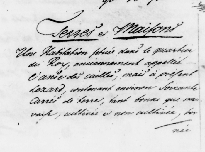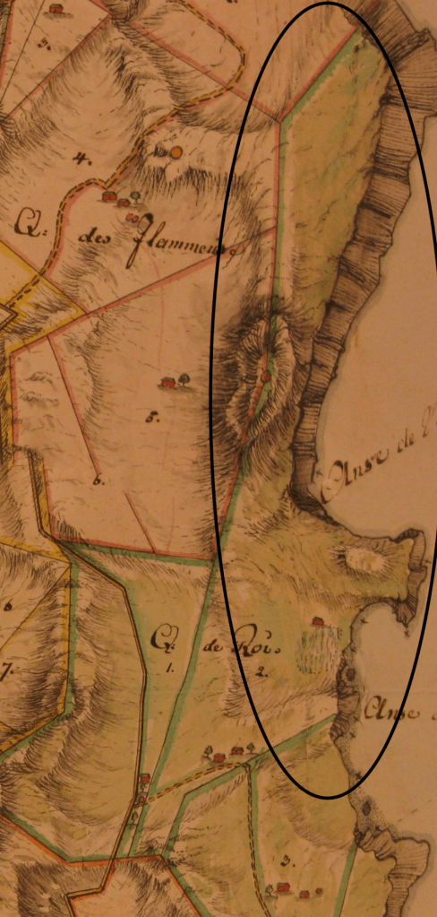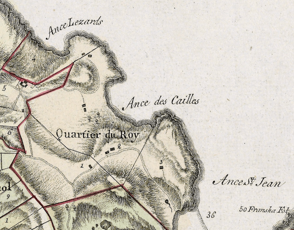 D’après ce document, il semble que le « Quartier du Roy » est à ce moment là composé de deux parties, « Anse des Lézards » et « Anse des Cailles ». La pointe rocheuse qui sépare les deux anses semble faire partie de l’ « Anse des Lézards », en tous cas, elle faisait partie de l’ancienne Habitation.