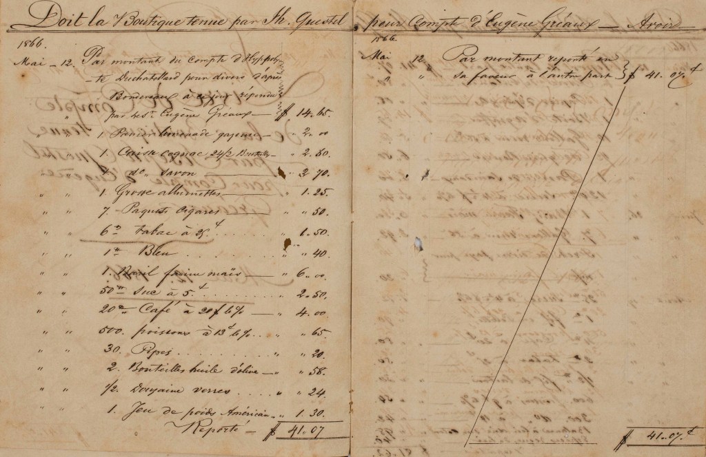 La boutique existe depuis le 12 mai 1866, mais Eugène GRÉAUX écrit qu’il « n’a pu obtenir que de faibles acomptes, qui ne peuvent couvrir son capital ».