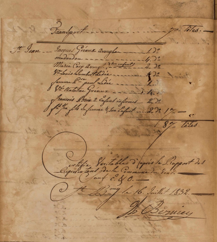 Disant, Messieurs, que dans la malheureuse et critique circonstance actuelle, il se trouve dans leur partie, des malheureux dont leur état inspire pitié et compassion ; qu’en conséquence ont absolument besoin d’assistance, le nombre desquels, petits et grands, se monte à 87 têtes (dont la liste est ci-annexée) et qui réellement sont dans l’indigence.