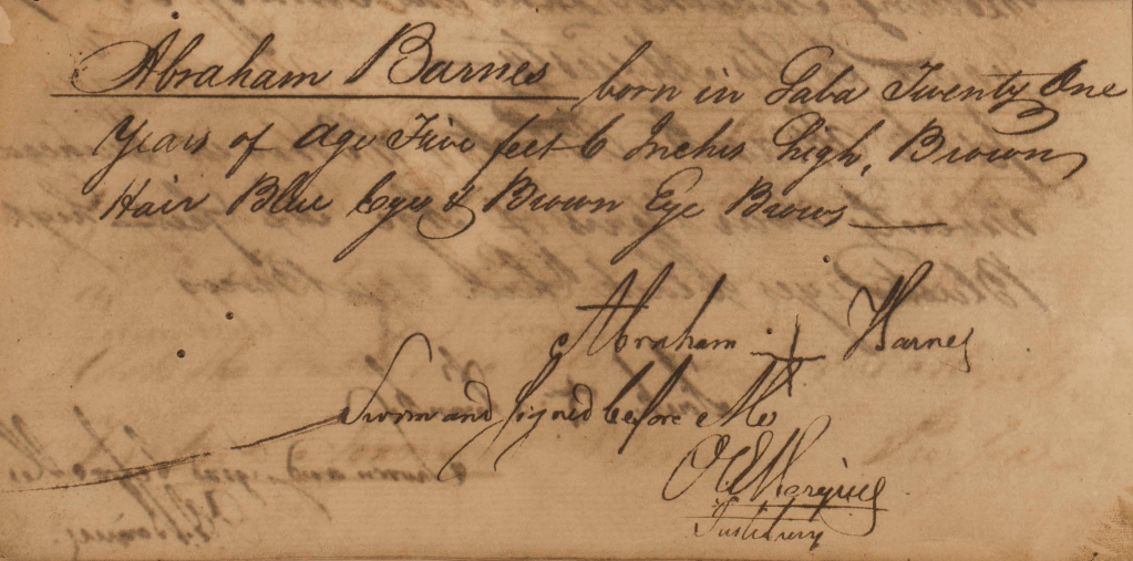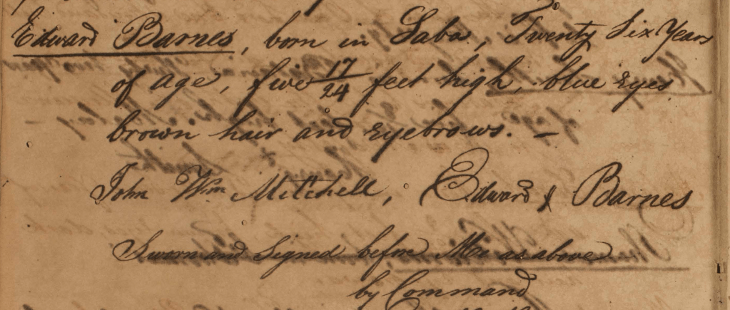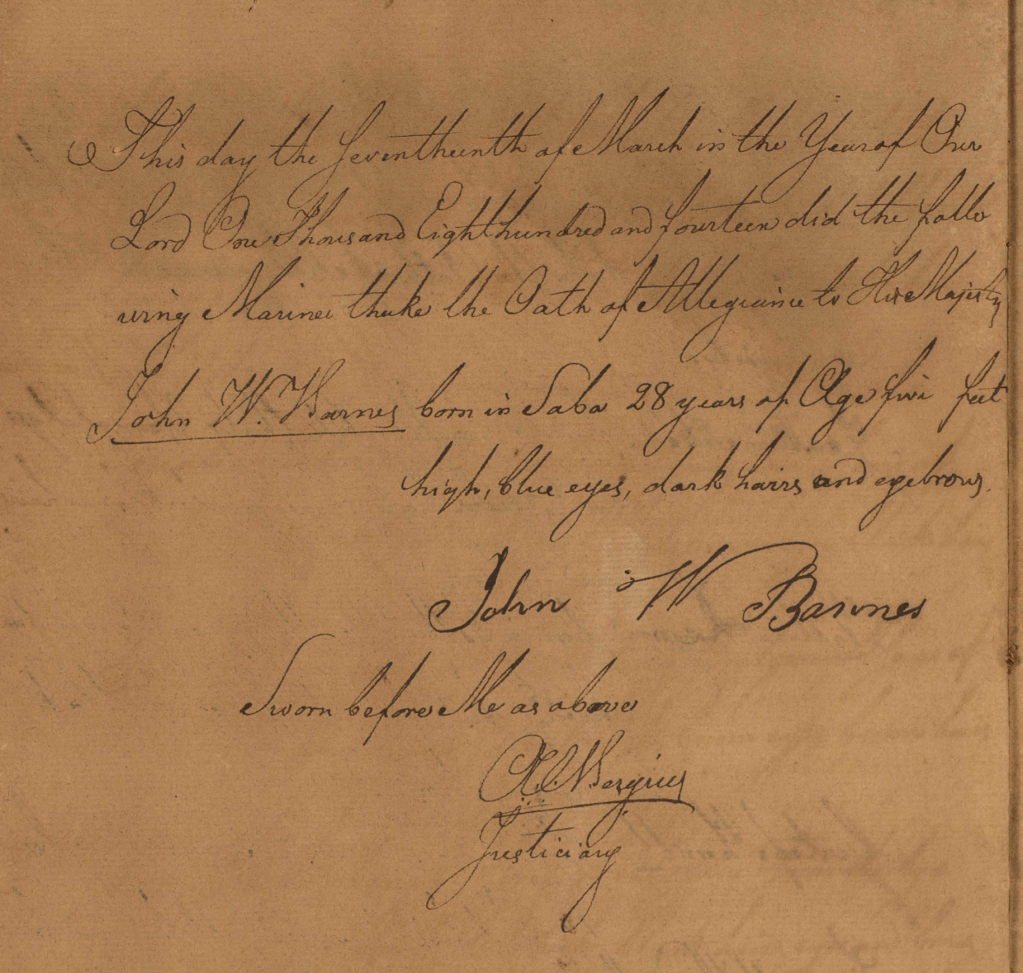 2 The oath of Abraham BARNES was also taken in 1814. He, also, was born on Saba. As he is 21, he would have been born there around 1793. He was five feet six inches tall, and had brown hair and blue eyes. He cannot sign.