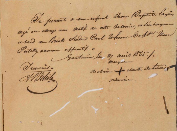Le 25 avril 1835, Marie Marthe DUCHATELLARD autorise son fils, Jean Baptiste LAGOIS, âgé de douze ans et natif de cette colonie à s’embarquer comme apprenti à bord du brick Suédois Carl Johan, Capitaine John PORTELLY.