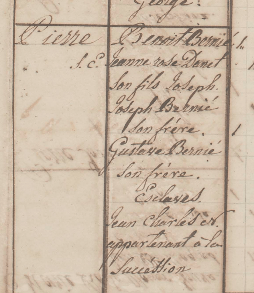 Benoit BERNIER décède le 6 juillet 1837. Dans la succession qui s’en suit, on apprend qu’ils possèdent deux terrains, dont un construit d’une maison en charpente, le tout évalué pour 83 gourdes. Ils possèdent aussi un esclave, « Jean Charles, nègre d’ici, âgé d’environ 29 ans » évalué pour 123 gourdes. On mesure bien ici la valeur d’un esclave comparée à celle de deux morceaux de terre et d’une maison en charpente. L’esclave représente un très gros capital pour cette. C’est un investissement qu’il faut faire fructifier et c’est pour cela que, dans le cas qui nous occupe, il est autorisé à s’embarquer sur un bateau : il va travailler et rapporter de l’argent à ses propriétaires qui n’ont sans doute pas besoin de lui pour des travaux d’agriculture sur leurs terres.