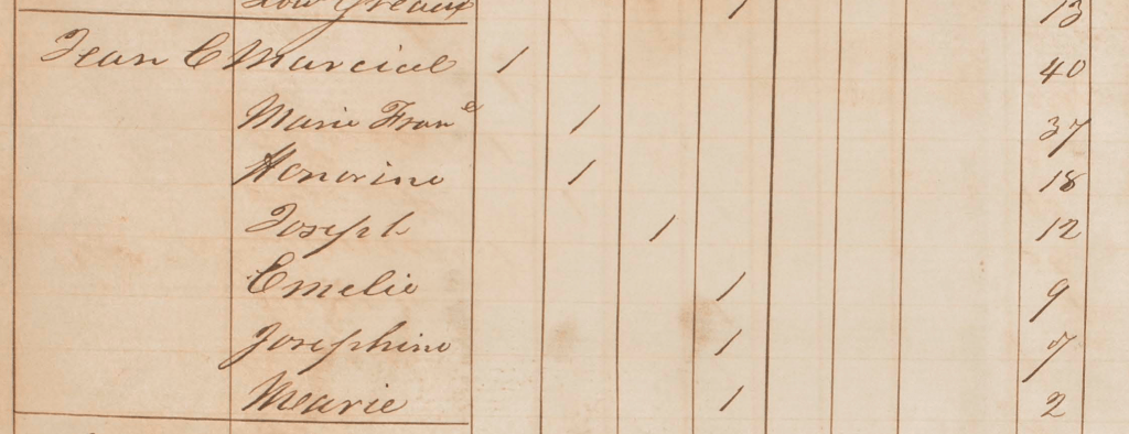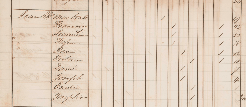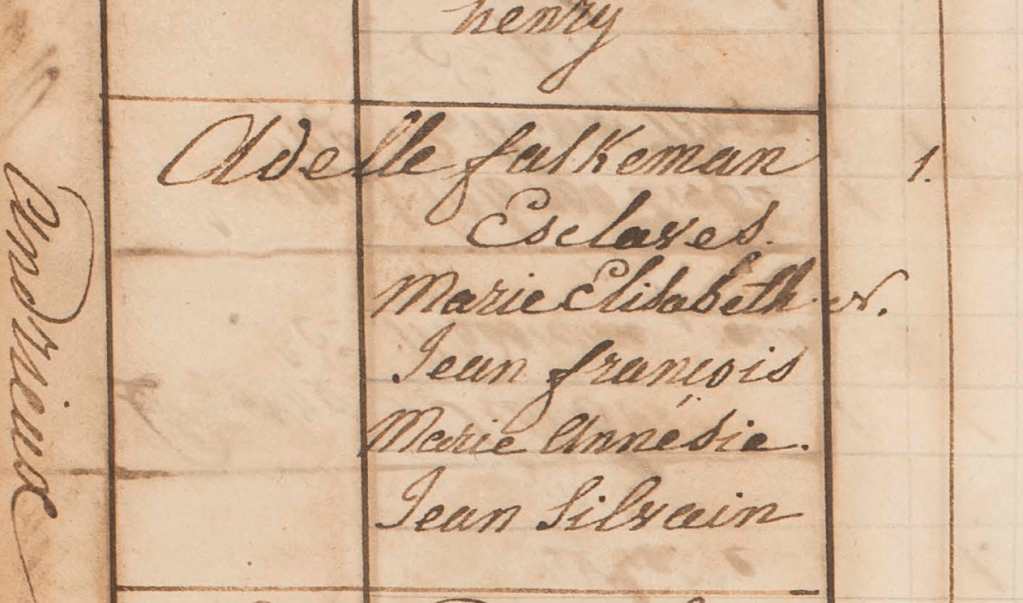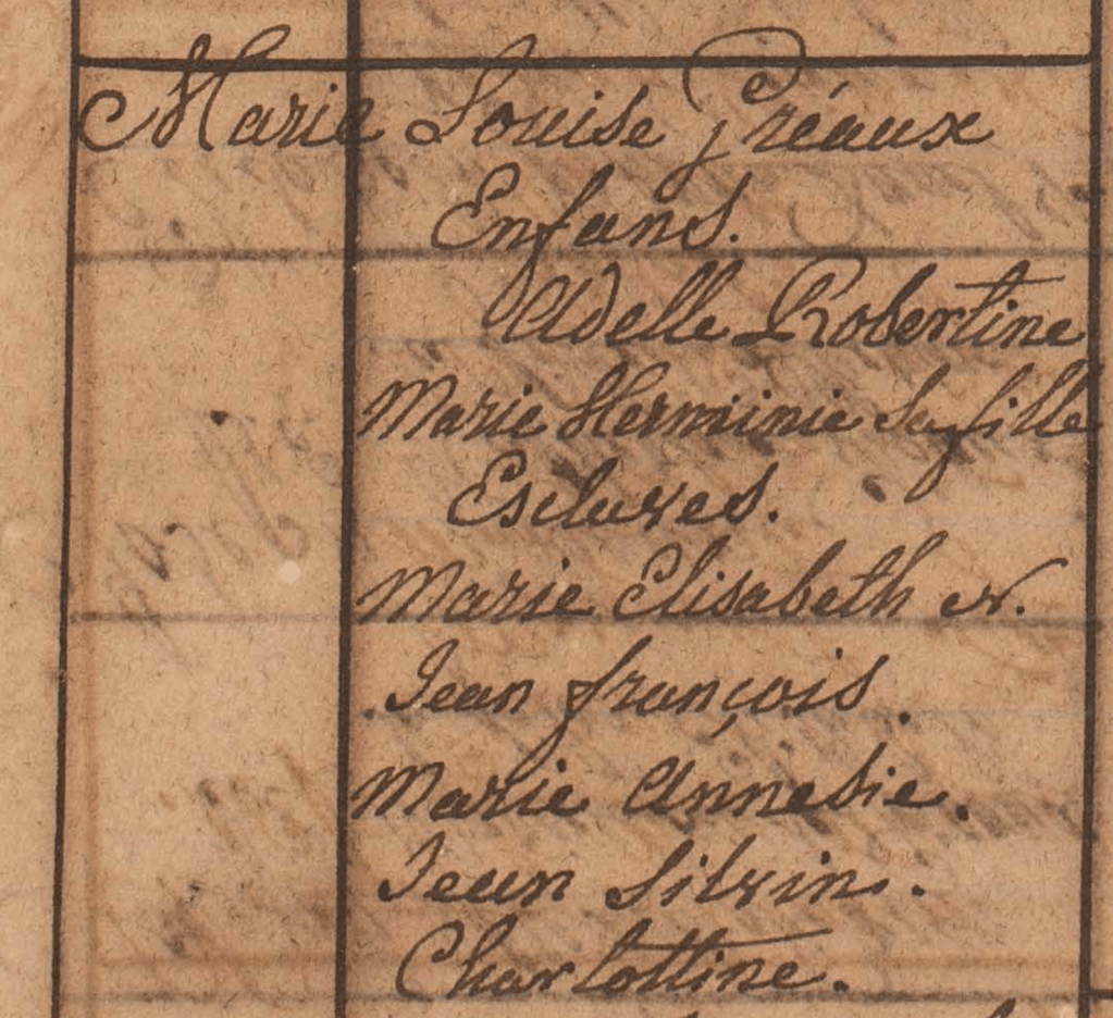 Marie Elisabeth, avec ses enfants, chez Adèle FALKMAN (la fille de Marie Louise GRÉAUX) à l’Andrieux. Ils sont toujours esclaves.