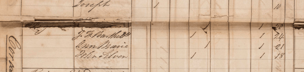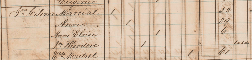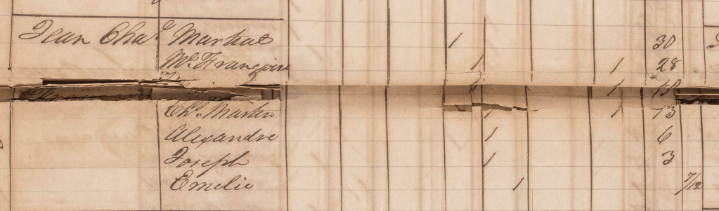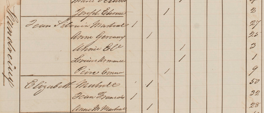 Cette même année, Marie Elisabeth est esclave chez Marie Louise GRÉAUX veuve du Suédois Ludwig FALKMAN. Elle est dite âgée de 39 ans, elle a trois enfants avec elle, Anesie, 6 ans, Jean Silvain, 4 ans, mais aussi Jean François, 10 ans, et peut-être Charlottine sur laquelle je n’ai rien. Jean François est bien le fils de Marie Elisabeth, mais il est d’un autre père, un Jean « LÉDÉE ». Jean François dit « LÉDÉE » et il épousera une Marie Louise GARRIN en 1868. On peut ne manquer de s’interroger sur ce que pouvait être la vie d’une esclave avec trois ou quatre enfants à sa charge.