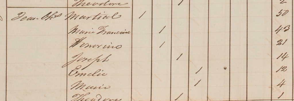 Ce Jean Charles a cinq ou six enfants, tous nés entre 1840 et 1854 au Corossol sous le patronyme MARTIAL. Son épouse est tantôt dite Marie Françoise avec, ou sans patronyme : « ADAM » ou « Dite GRÉAUX » ou « Penne ». Les différents surnoms pour une même personne peuvent sans doute être expliqués par l’absence d’état civil fiable pour d’anciens esclaves, avec des références au père, à la mère ou à un propriétaire en fonction des souvenirs des uns et des autres. Je n’ai pas de descendance pour ce couple à Saint-Barth.