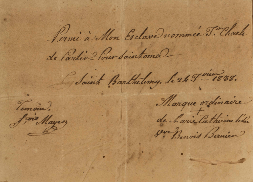 Le 24 janvier 1838, Marie Catherine LÉDÉE, veuve Benoit BERNIER, autorise son esclave Jean Charles à partir pour Saint-Thomas.