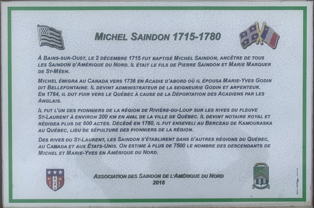 Presque au centre de cette place, se trouve une plaque commémorative, placée là par l’Association des SAINDON de l’Amérique du Nord, et ça, voyez-vous, ça me cause. Notez bien que je n’avais jamais entendu parler de ce Michel SAINDON, natif de Bains-sur-Oust et ancêtre des SAINDON d’Acadie puis, du Canada, colon portant les couleurs de la France de l’autre côte de l’océan Atlantique, laissant après lui une descendance aujourd’hui fière de ses origines. Michel SAINDON est la deuxième personnalité du lieu.
